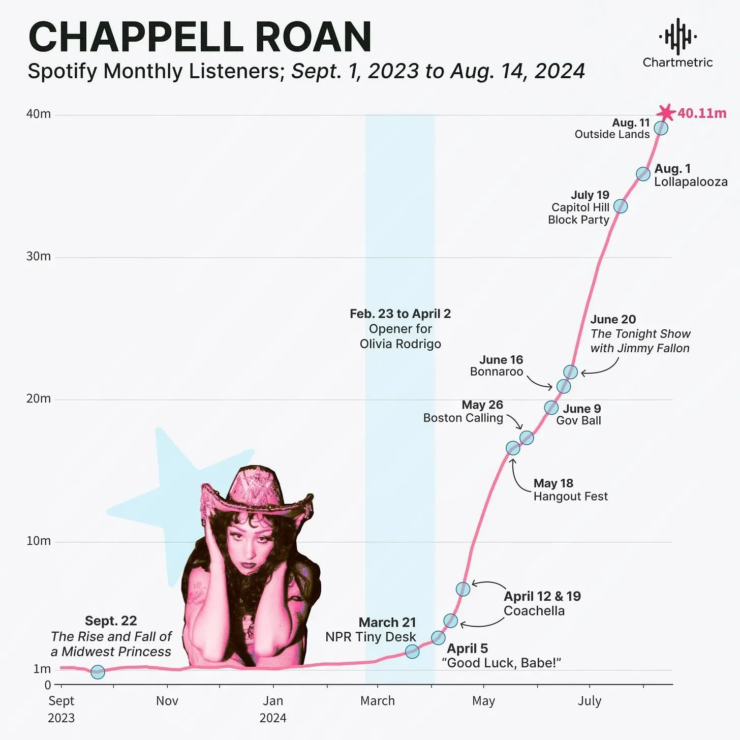 The way the public started falling for her was largely based on strategic live performances, initially the opening act for friend Olivia Rodrigo which kickstarted her exponential jumps in listens. Coachella is the moment the music fans start jumping on board and by the time she attracts the largest crowd Lollapalooza has ever seen (over 110.000!) her superstardom has become undeniable.