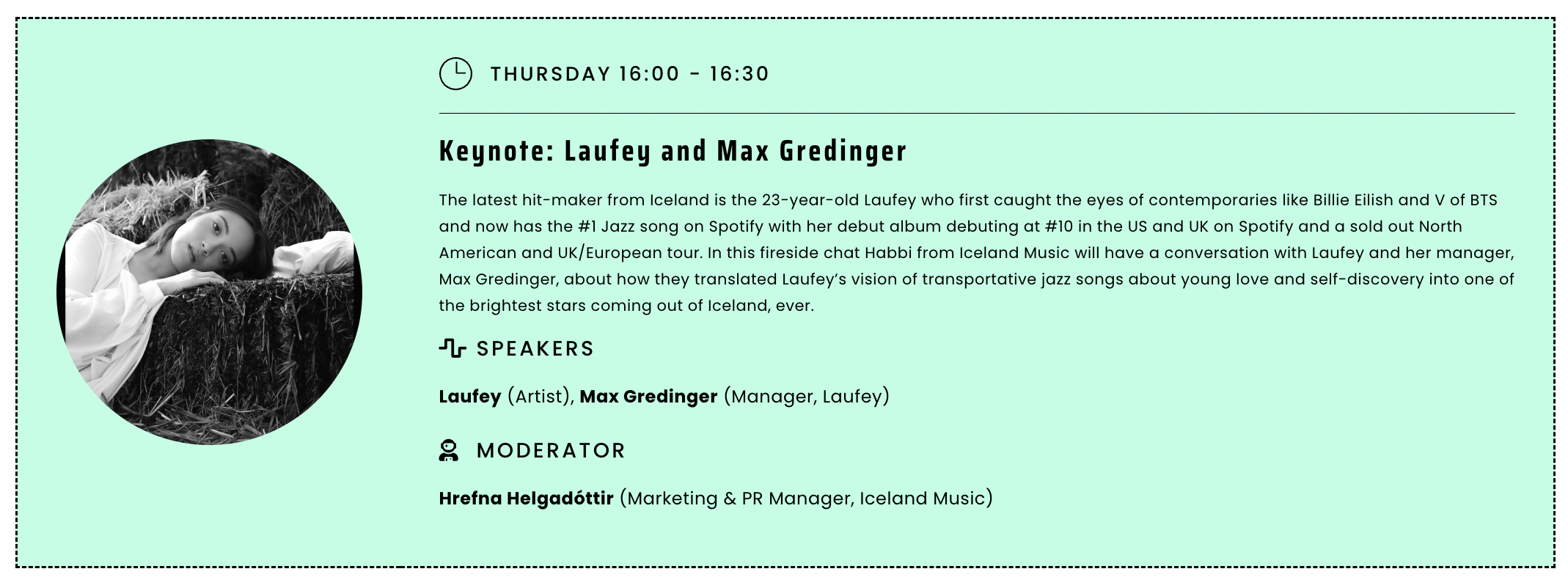 In this fireside chat Habbi from Iceland Music will have a conversation with Laufey and her manager, Max Gredinger, about how they translated Laufey’s vision of transportative jazz songs about young love and self-discovery into one of the brightest stars coming out of Iceland, ever.